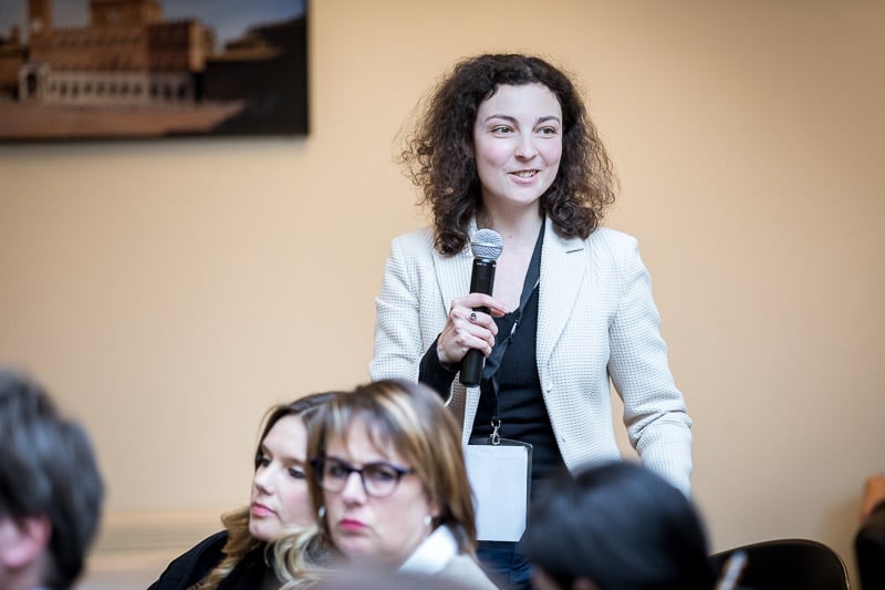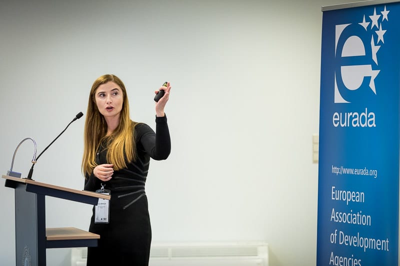A woman engaging with a participant in the audience during an event for EURADA in Brussels