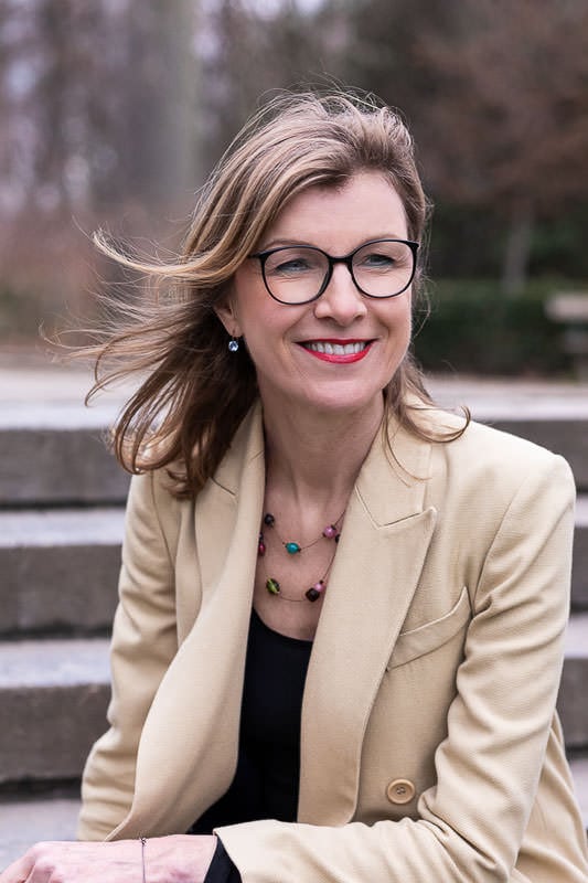 Portrait of Birgitta Bechtold wearing a light brown jacket at Leopold Park, Brussels